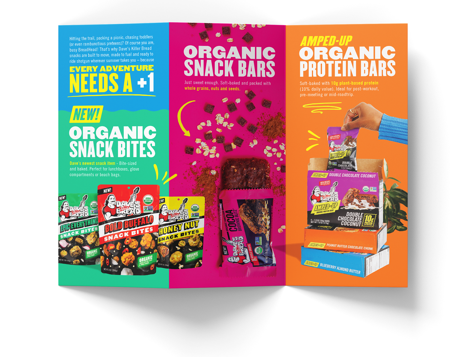 We sent out Hydroflask coolers featuring Dave's Killer Bread snacks to kick off the summer. This insert was meant to get the consumer excited to bring these snacks on their summer adventures.